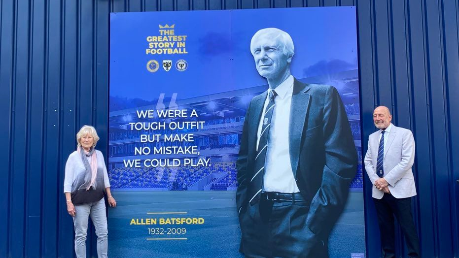 The man considered by most to be Wimbledon’s greatest manager takes pride of place in this feature on the outside of the south east corner of the stadium. Allen amazingly secured an FA Cup third round win in 1975 for lowly non-league Wimbledon over top division Burnley (plus a draw at European high-fliers Leeds at Elland Road), as well as the three consecutive Southern League championships in the mid-1970s which paved the way for Wimbledon FC’s historic election to the Football League in 1977. Allen’s widow, Maureen Batsford, was present on Saturday to see the unveiling of this wonderful celebration of one of Wimbledon’s all time greatest. “I’m so proud”, she said. “It’s just lovely”.