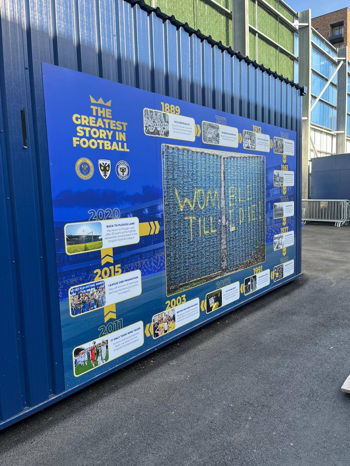 Outside the East Stand, this mural complements the original which has pride of place close to the timeline in the main West Stand concourse. The new mosaic depicts the closed, graffiti’d blue gates of the old Plough Lane stadium and features more photos of fans from different eras whose photos did not feature in the original artwork. It now has almost 3,000 separate images from 440 fans. An additional feature of the new mosaic is another timeline of the football club which surrounds the main mosaic – a celebration again of the rich history of football in Wimbledon.