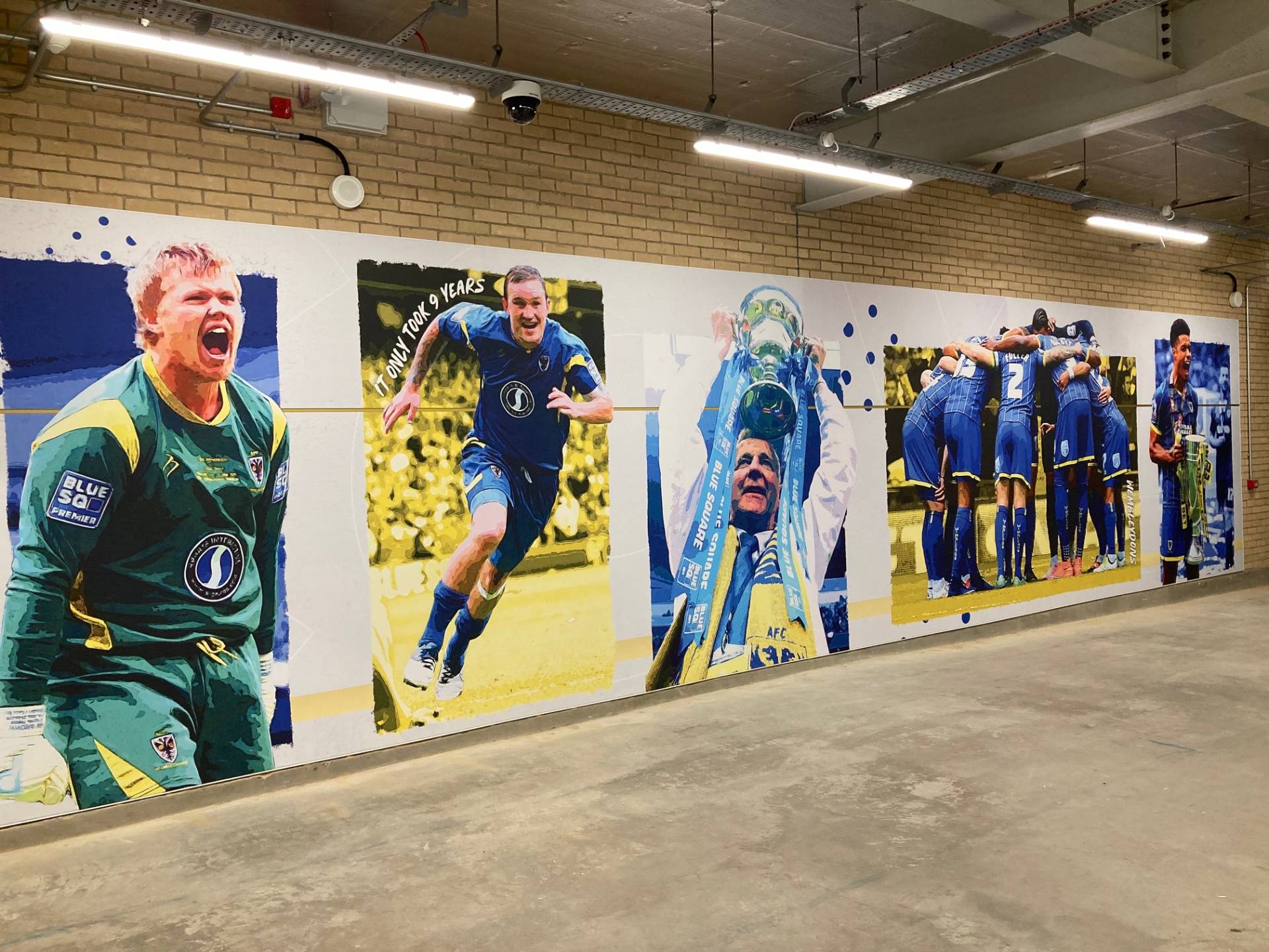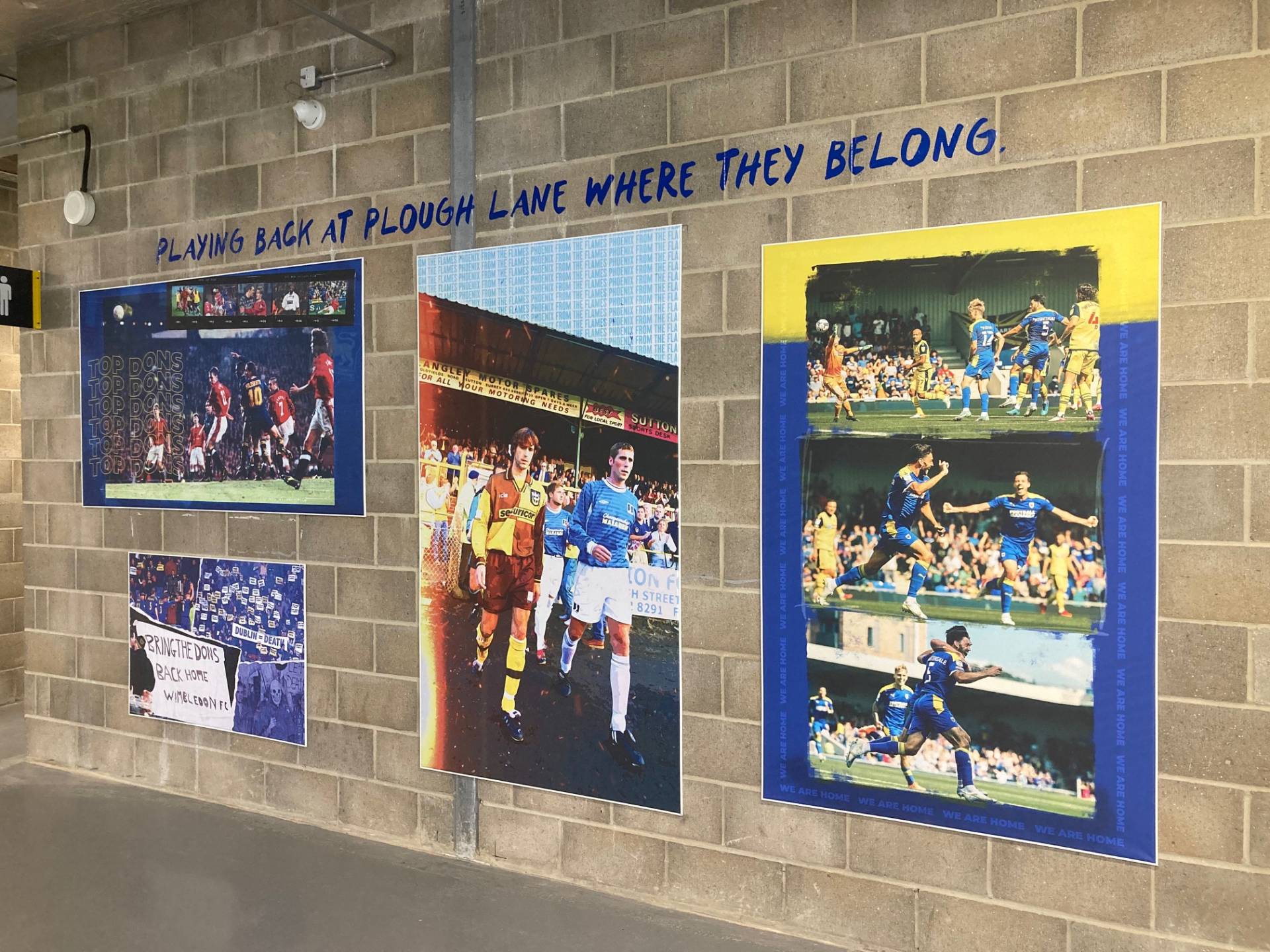This is the first eye-grabbing feature to greet you when entering the West Stand at the top of the stairs before the turnstiles. This (near) ceiling to floor installation, on both sides of the concourse, celebrates four outstanding, successful years in Wimbledon’s footballing history – 1963 (FA Amateur Cup Final win at Wembley); 1988 (FA Cup victory over Liverpool at Wembley); 2011 (winning promotion back into the Football League with victory over Luton in a play-off final in Manchester City’s stadium); and 2016 (securing promotion to League One by defeating Plymouth in a play-off final at Wembley).